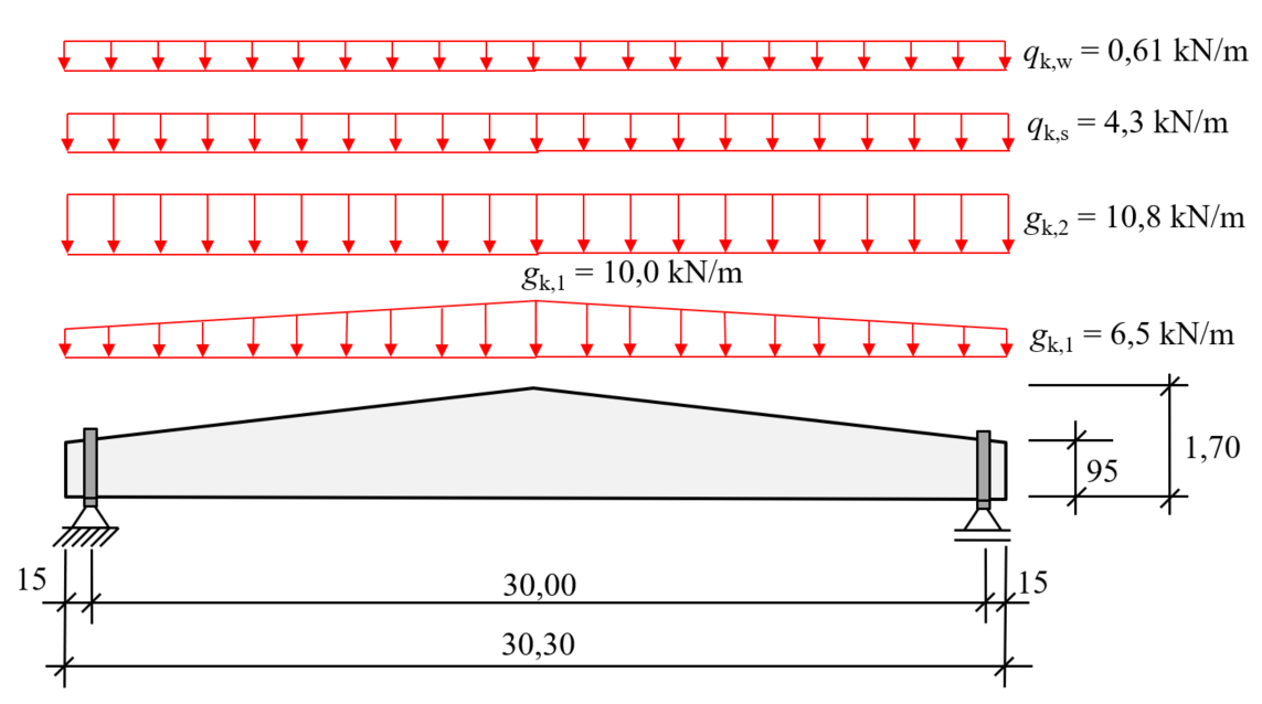 - Eigengewicht Trägeranfang/ende: gk,a = 6.5 kN/m, Trägermitte: gk,m = 10.0 kN/m